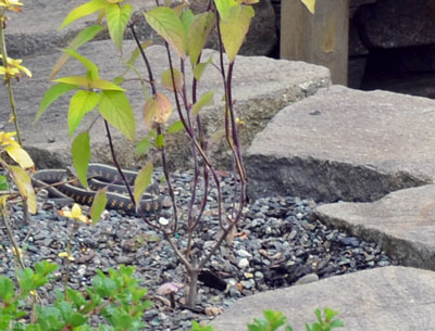 Then, I selected leaves on left bush and saved selection. This way when I cloned I wouldn’t cover up the bush in the foreground. I next inverted the selection and cloned the yellow flowers behind the bench all the way over. While doing that I discovered there’s a snake in the picture, just to the left of the bench in the gravel.