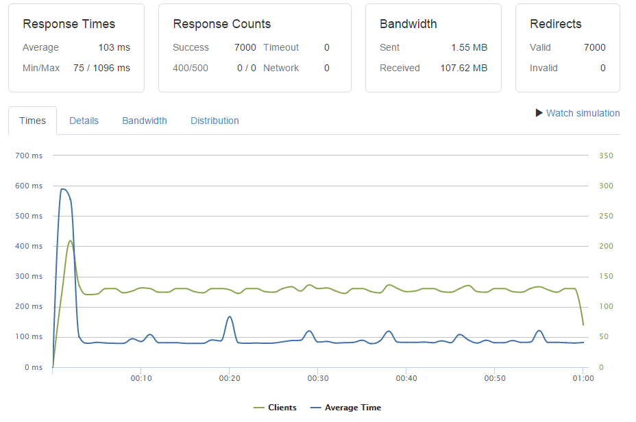 Well, you use a load tester. And though there are many ways of load testing I use Loader. Loader is a free load testing site that will test a number of users/clients hitting your site within one minute. And I’ve tested up to 10,000 clients for free. It will give you a readout like this:
