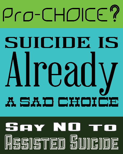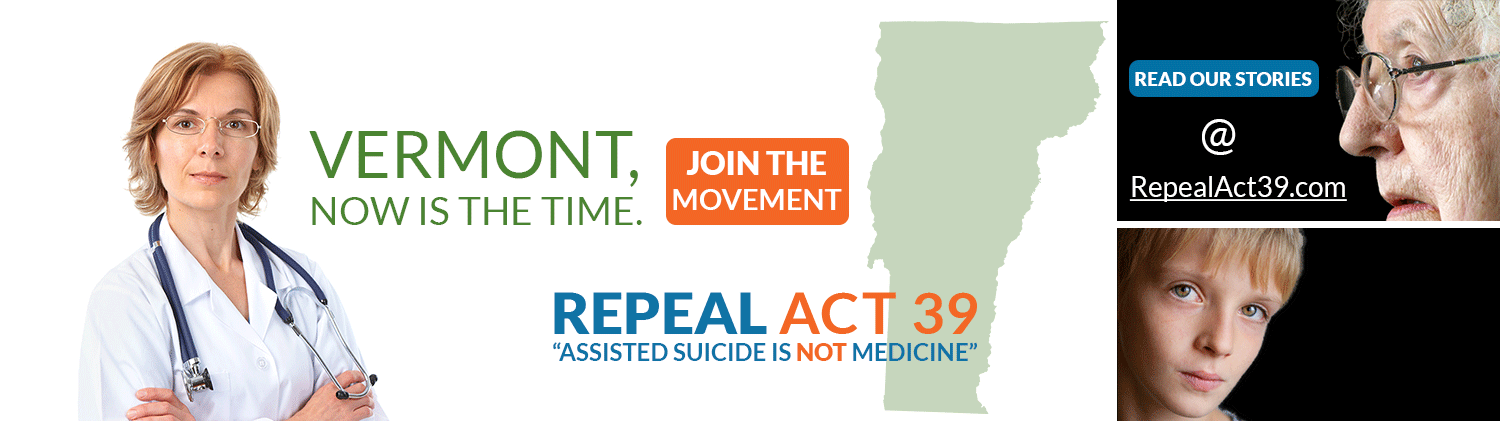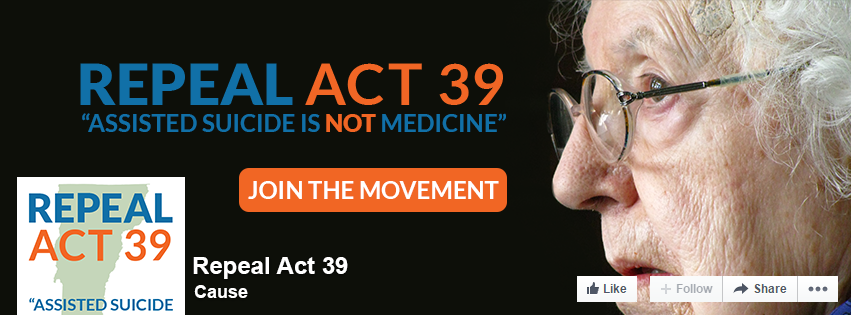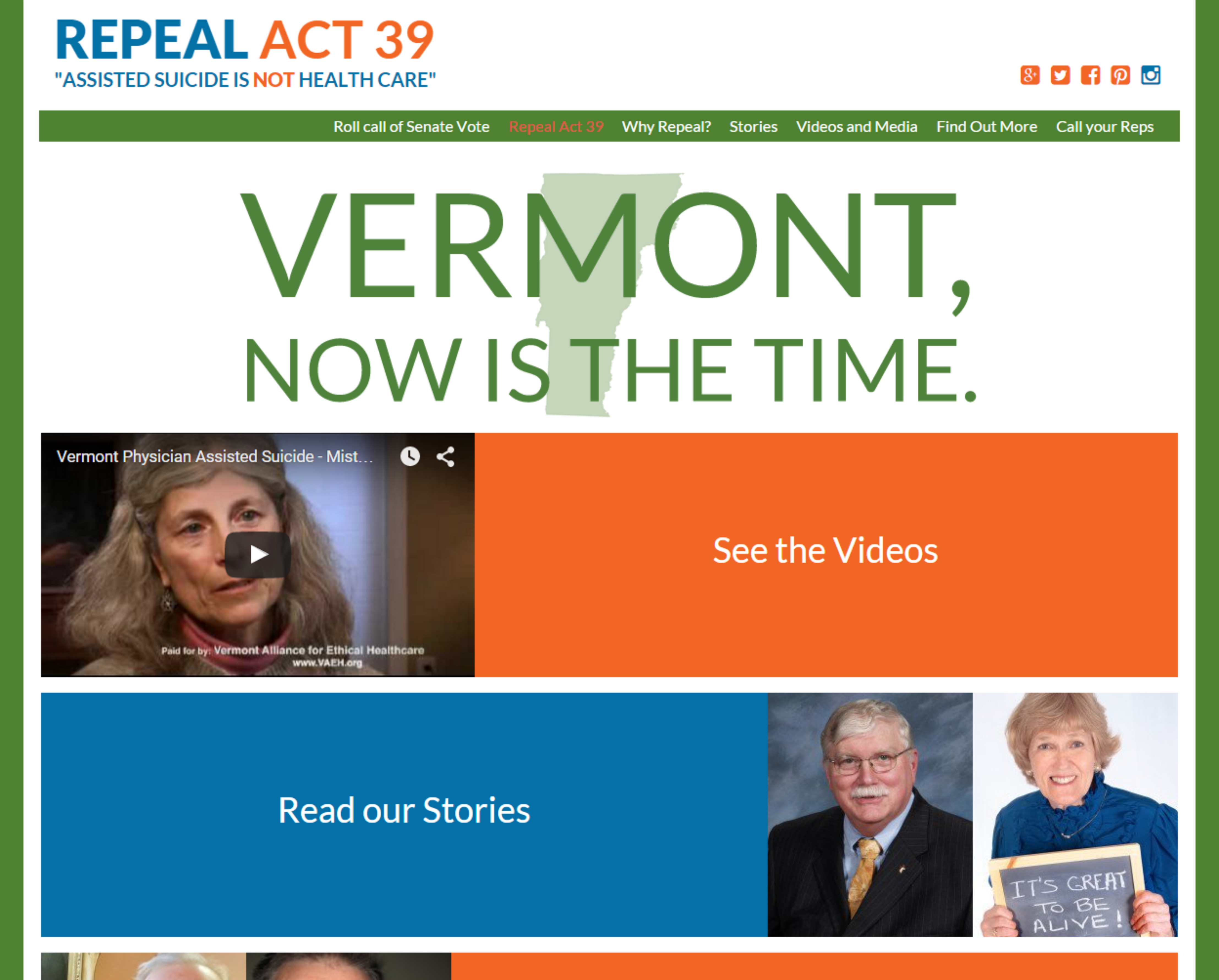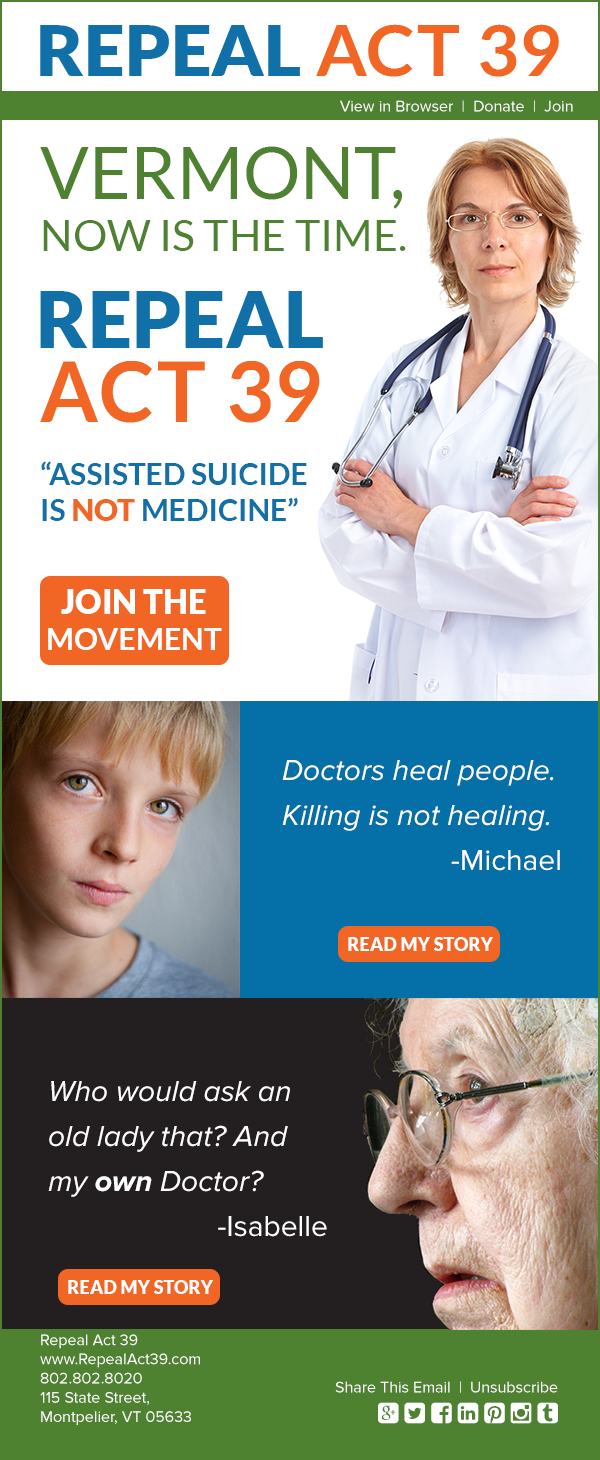 My client is the campaign to repeal the assisted suicide law (act 39) in Vermont, which was narrowly passed last year. It should be noted that the this mockup campaign is for class, and any implemented campaign will involve different photos. These stock photos are for illustration purposes only.