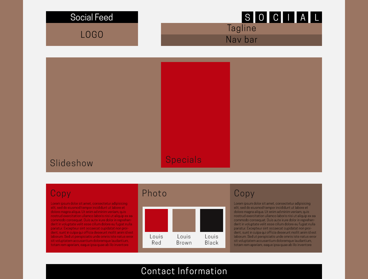 Louis Lunch Wireframe To setup the 1280 x 972 pixel wireframe, I first pressed cntrl k to setup a grid at 80 px with 10 divisions within each 80px. And I used 80px and half of 80 (40) px as my design scale. I displayed the grid and set snap to, so that my guides and blocks would snap nicely to the grid. I first set guides at 80px from the left and right, and then set a grey background between them. Next I pulled the logo and shop image from Louis’ website and pulled the three swatches from them. Louis’ red and brown from the shop and the black from the logo. I then locked the background layers and proceeded to layout the different required elements.